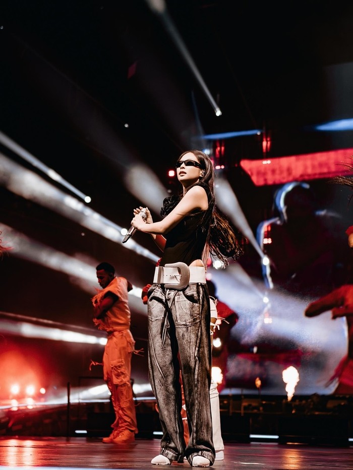 In additional photos, Jennie displayed her style versatility by wearing an oversized black top with a prominent white belt paired with wide-leg pants, creating a hip and stylish streetwear-inspired look that contrasted with her bold red performance outfit.